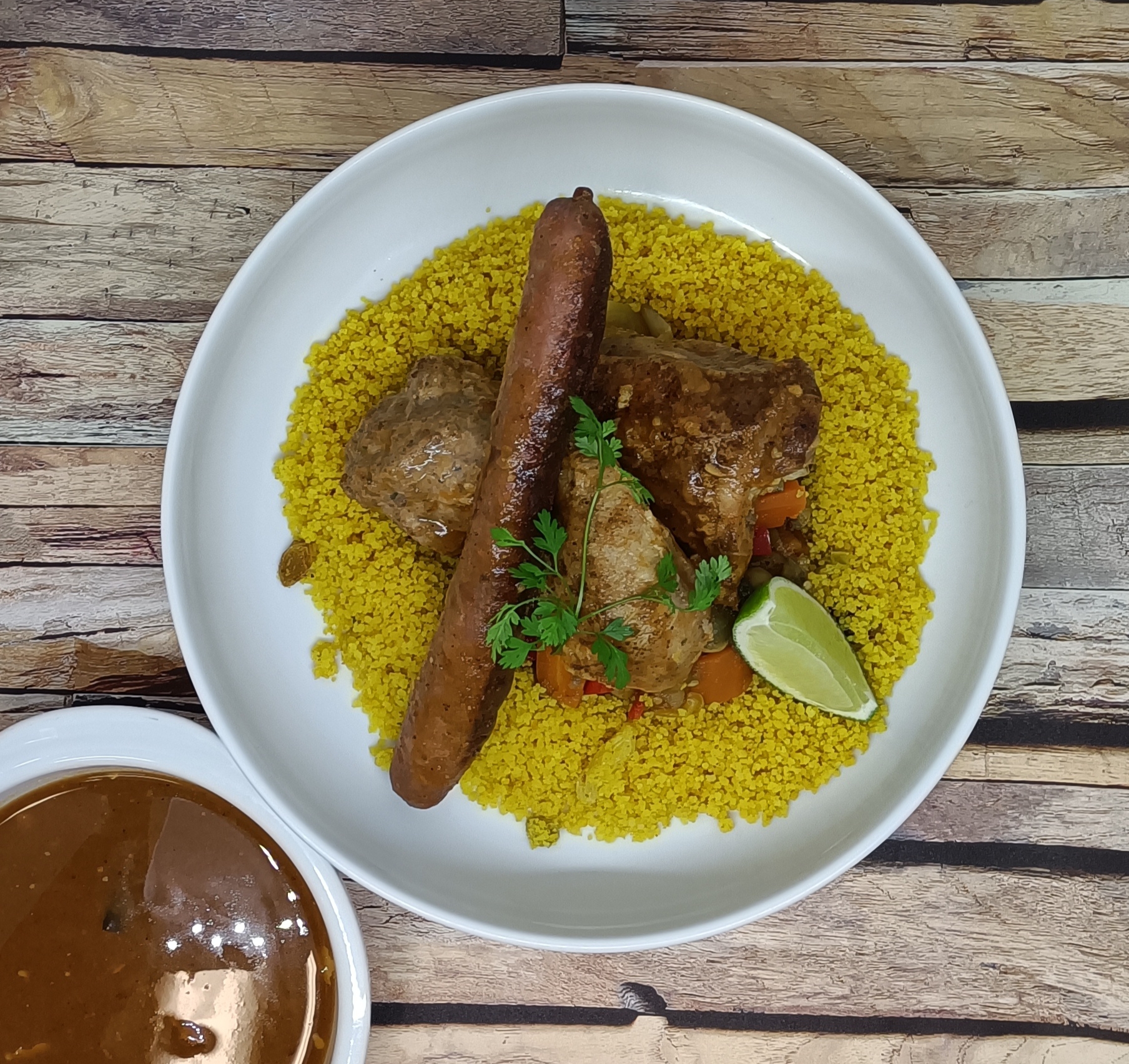 Composition : cuisse de poulet, merguez, kefta, poivrons rouges verts et jaunes, courgettes, carottes, aubergines , oignons, célerie branche, navet, célerie rave, épices à couscous, concentré de tomates, harissa, pois chiches, sel et poivre et huile d’olives;