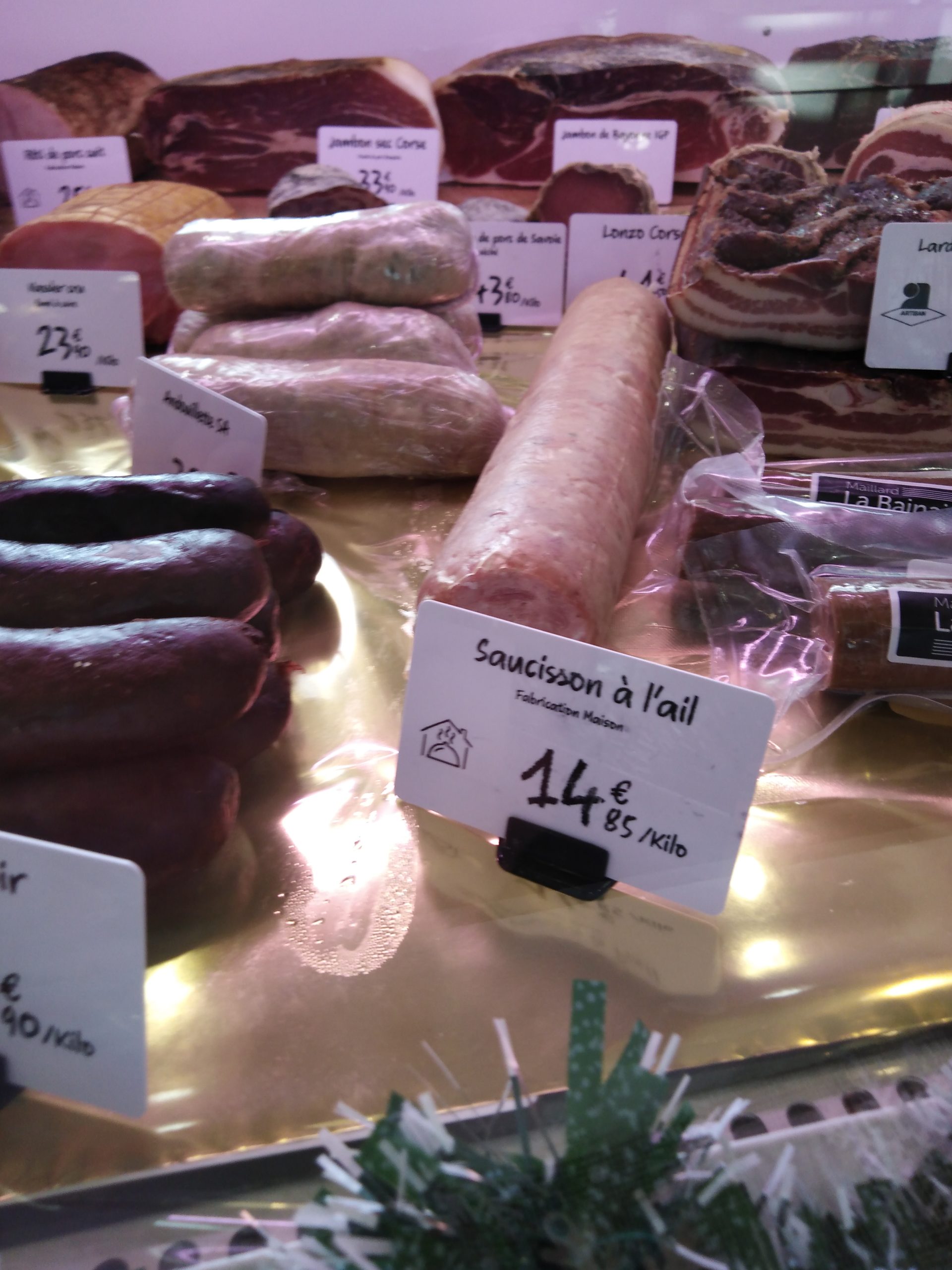 Accueil / Boutique / Charcuterie / Saucisson à l’ail Saucisson à l’ail1.48 € quantité de Saucisson à l'ail Ajouter au panier Catégorie : Charcuterie Étiquette : Fait maison Description Informations complémentaires Description Saucisson fait maison 14,85 le kilo le prix indiqué est pour 100 grs Informations complémentaires Poids 100 kg Produits similaires Saucisson sec au poivre vert 7.50 € Ajouter au panier Foie gras entier de canard 19.50 € Ajouter au panier Boudin blanc classique 1.69 € Ajouter au panier Coquille de saumon 4.90 € Ajouter au panier